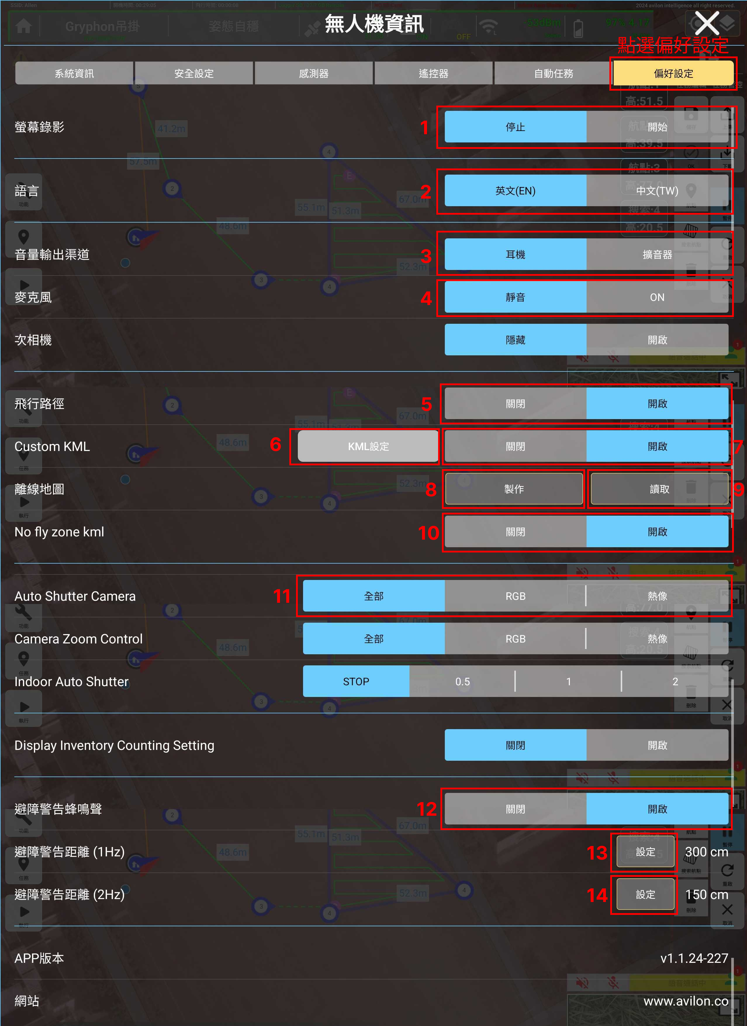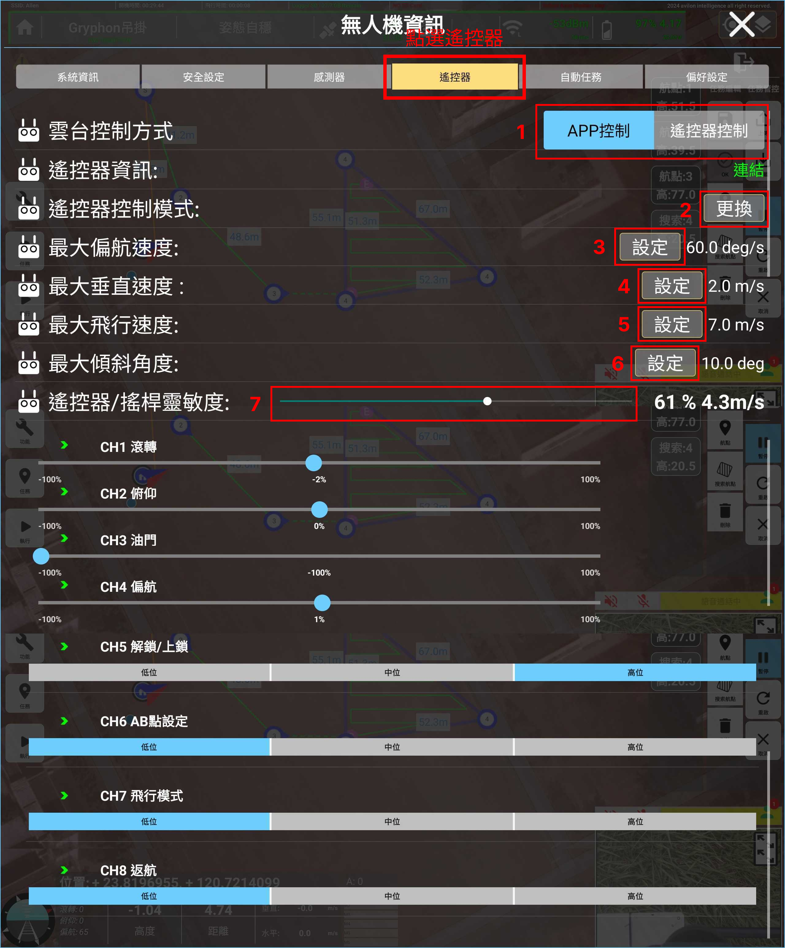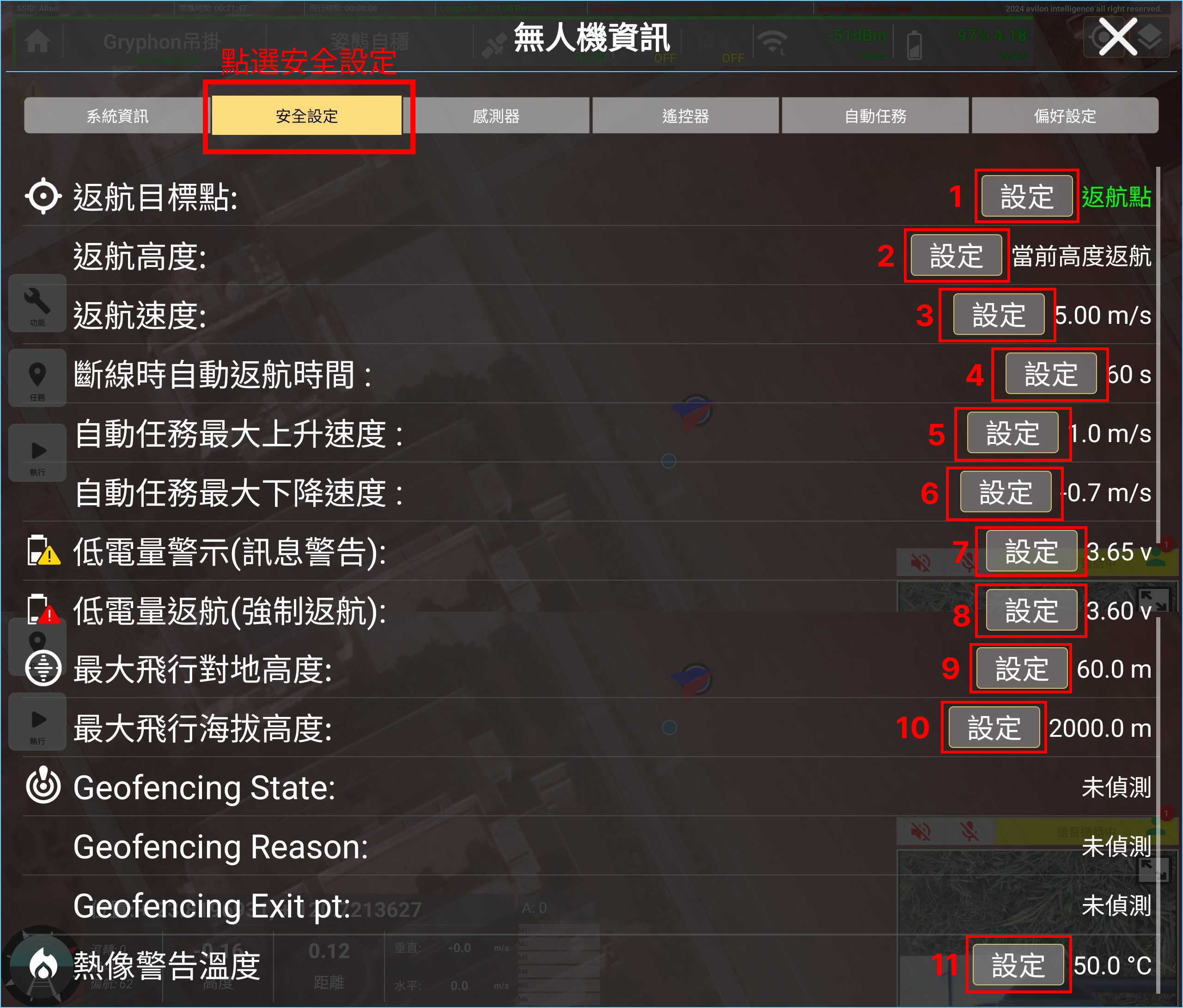 於安全設定頁面,可以設定返航點、返航高度/速度、低電量警告、低電量返航等等安全設定。