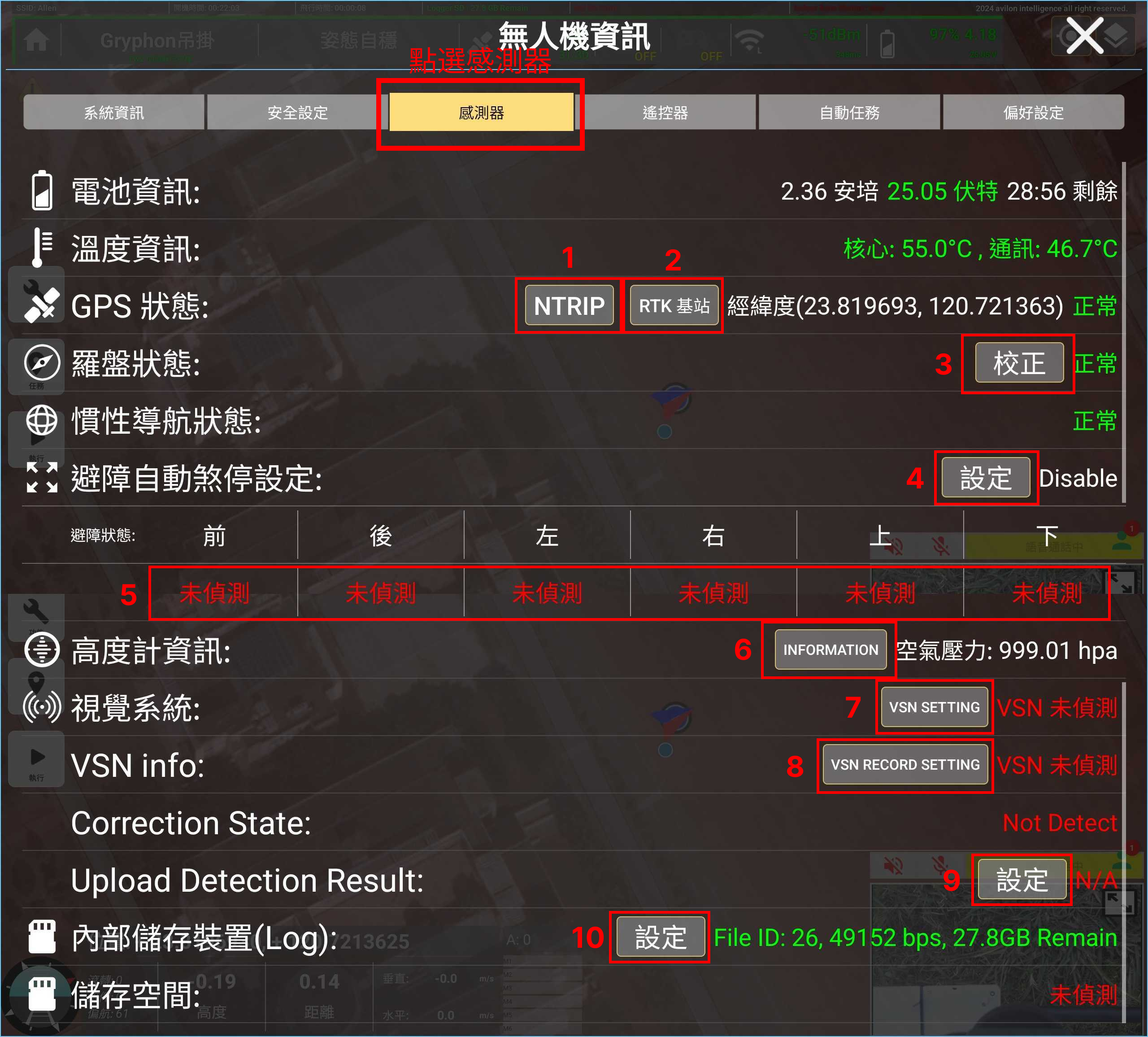 於感測器頁面,可查看感測器狀態,於GPS狀態列可設定RTK修正站或是NTRIP國土測繪E-GNSS