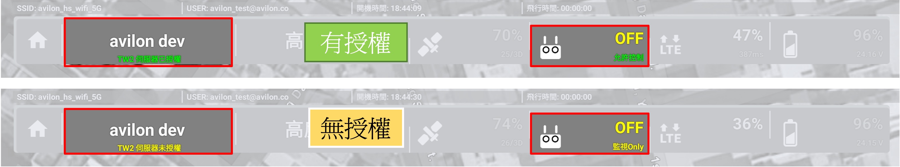 | 取得控制權限才能對無人機下達控制命令 1.起飛降落之權限 2.雲台與相機控制之權限 3.酬載控制之權限 4.附屬設備配置之權限(RTK修正、降落坪選擇) 5.參數設定與返航之權限 6.任務與航點設定之權限 7.校正之權限 8.修正站設定與降落點配置之權限 ※每台無人機止只有一個控制權,但監視權沒有限制。 |