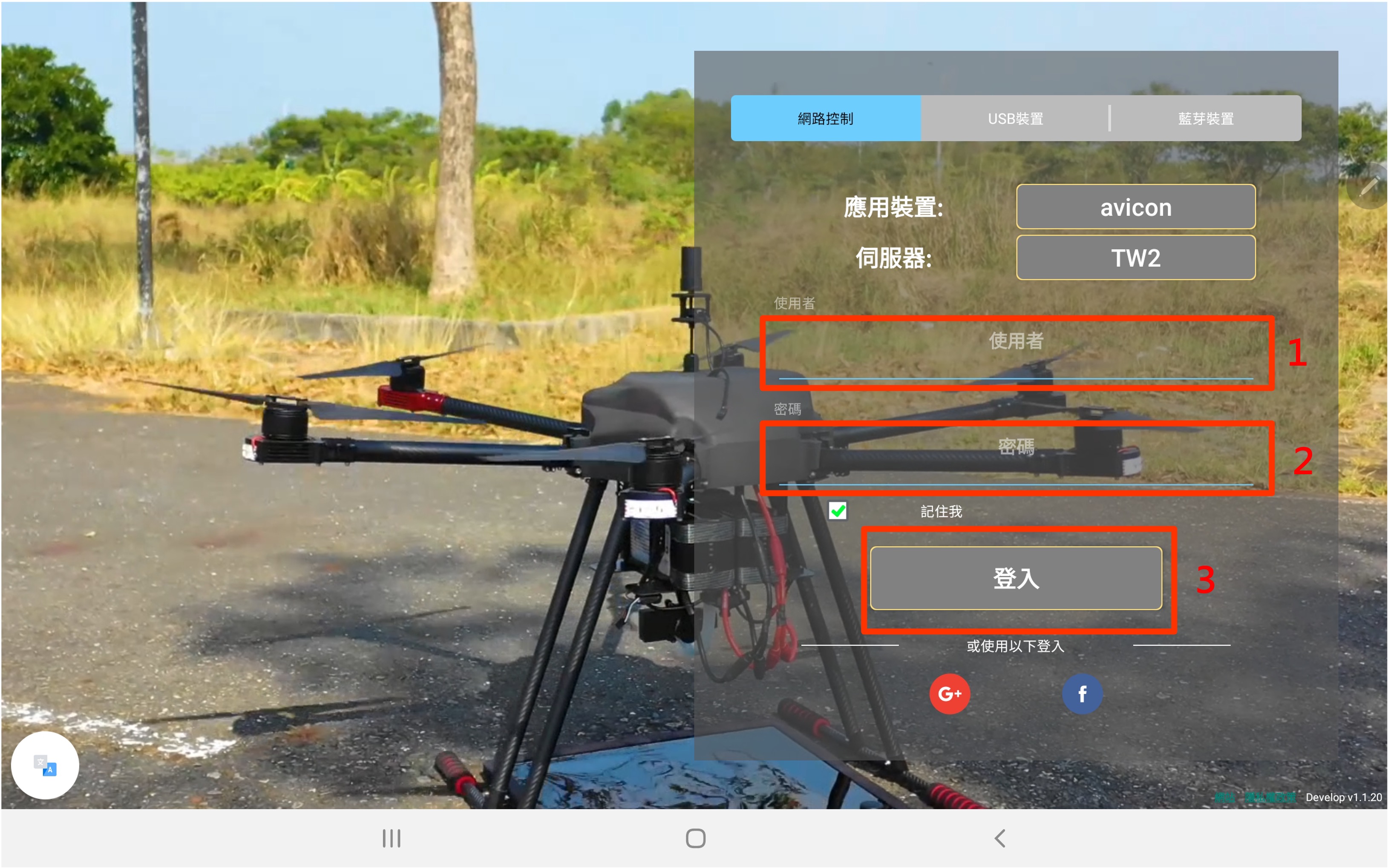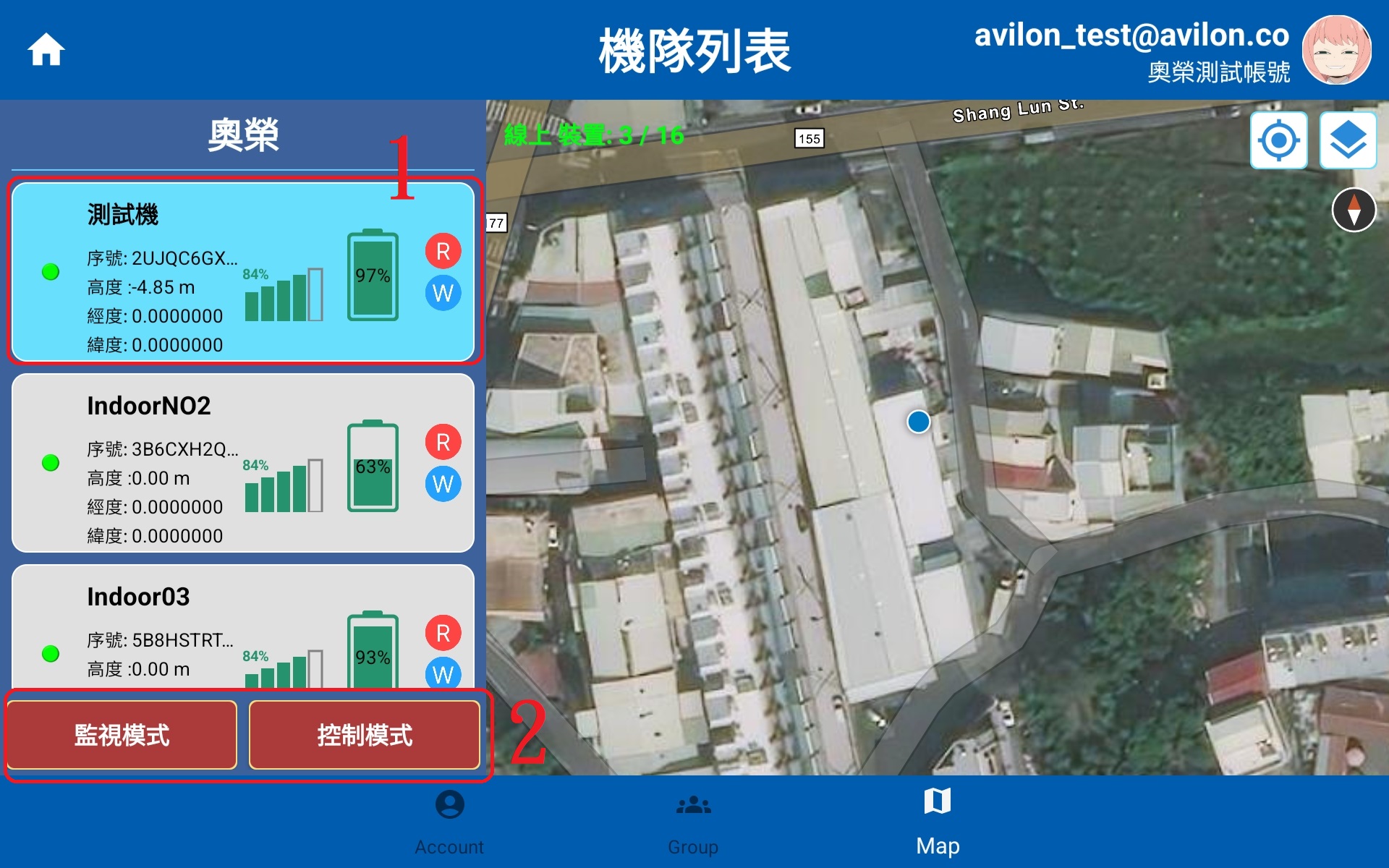 登入成功後左方列表會顯示機關所擁有的無人機,選取欲監視或控制之無人機,再選擇登入模式